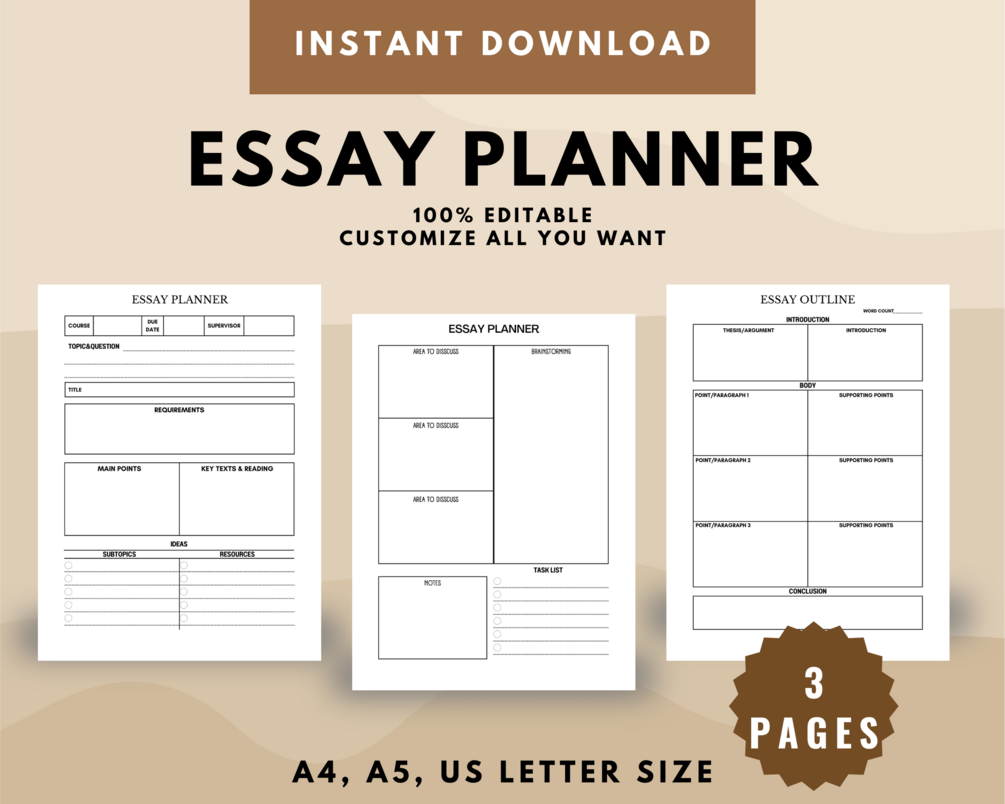 Priintable Essay planner 3 pages. Editable using Canva